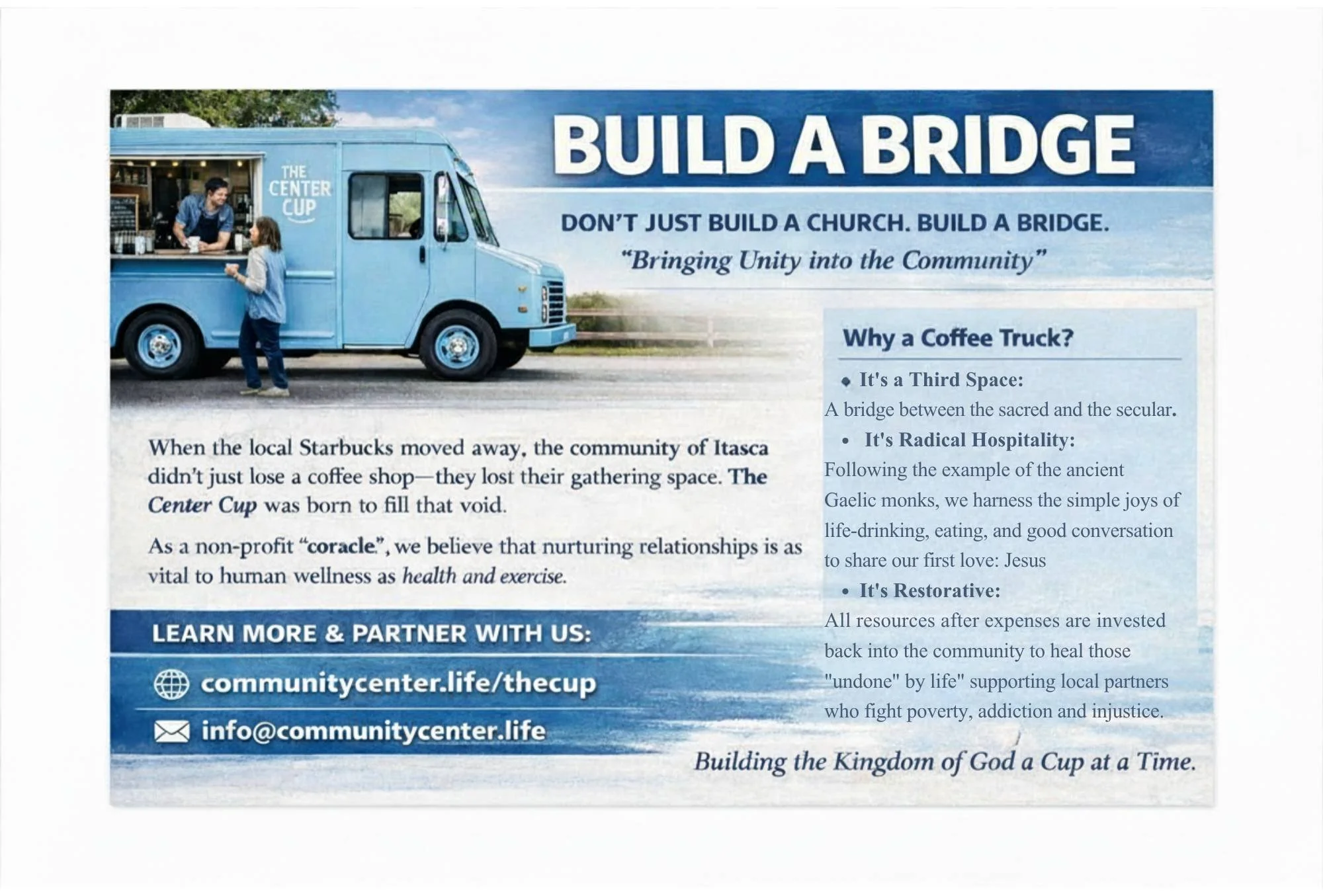 The Center Cup is Itasca’s first and only non-profit coffee shop. It exists to foster conversations to connect and unify our community. By choosing our coffee and pre-packaged baked goods, you are taking the first step in healing our fractured world.